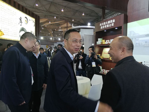 推介會后,與會相關(guān)領(lǐng)導(dǎo)和各市州負(fù)責(zé)人參觀了正在舉辦的第六屆四川國際健康和養(yǎng)老產(chǎn)業(yè)博覽會四川中醫(yī)藥主題展區(qū)。圖為:省中醫(yī)藥管理局領(lǐng)導(dǎo)參觀我司的展臺。