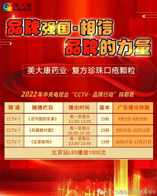 央視頻道,北京站LED廣告牌,財經(jīng)頭條、新浪財經(jīng)、財經(jīng)要聞等互聯(lián)網(wǎng)新媒體亦將同步追蹤報道。此次公司央視投放廣告,助力美大康品牌、復方珍珠口瘡顆粒的品牌發(fā)聲,為企業(yè)品牌建設,同步發(fā)聲!