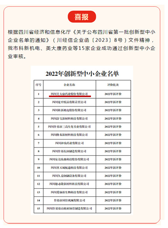 根據(jù)四川省經(jīng)濟(jì)和信息化廳《關(guān)于公布四川省第一批創(chuàng)新型中小企業(yè)名單的通知》(川經(jīng)信企業(yè)函[2023]8號(hào))文件精神,我公司成功通過創(chuàng)新型中小企業(yè)審核。創(chuàng)新型中小企業(yè)具有較高的專業(yè)化水平較強(qiáng)創(chuàng)新能力和發(fā)展?jié)摿Γ莾?yōu)質(zhì)中小企業(yè)的基礎(chǔ)力量。