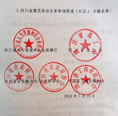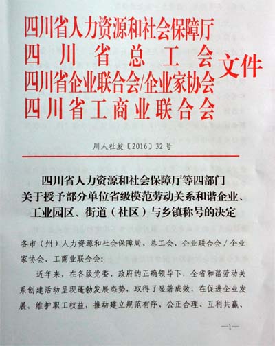 由四川省人力資源和社會保障廳、四川省總工會、四川省企業(yè)家聯(lián)合會/企業(yè)家協(xié)會、四川省工商業(yè)聯(lián)合會四部門以川人社(2016)32號文,授予我司等為省級勞動關(guān)系和諧企業(yè)稱號。